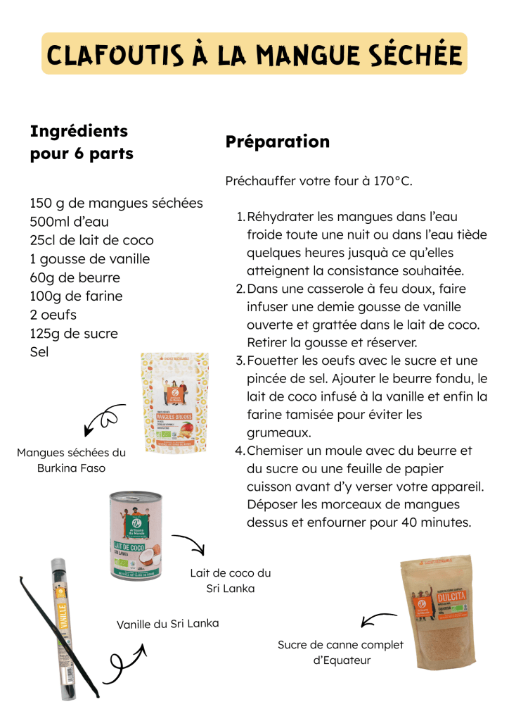 Dans notre deuxième coin recette, vous vous régalerez d’un clafoutis aux mangues séchées mis au point par Artisans du Monde en partenariat avec l’École des Cuistots Migrateurs. Nos excellentes mangues du Burkina Faso, dont vous ne pourrez plus vous passer sèches ou réhydratées, enchanteront vos différent plats, desserts et salades. En collation, elle est idéale pour sa teneur en fibres, vitamines et bien sûr, pour son goût sucré et légèrement acidulé!