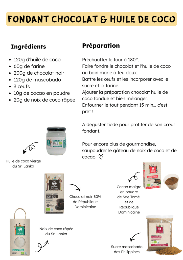 Notre recette du fondant à l’huile de coco et chocolat met à l’honneur PODIE, une organisation de producteurs, fondée en 1974 et qui accompagne plus de 1500 familles isolées, productrices d’épices et de produits dérivés de la noix de coco au Sri Lanka. Pour en savoir plus sur PODIE : https://boutique-artisans-du-monde.com/podie